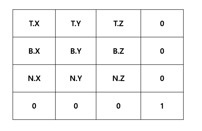 ex) 탄젠트 스페이스에서 좌표계가 (0, 0, 1)이 잡히면, 우리가 원래 사용하던 노말(정점에서 제공해주는 노말)이랑 똑같다는 의미이다.