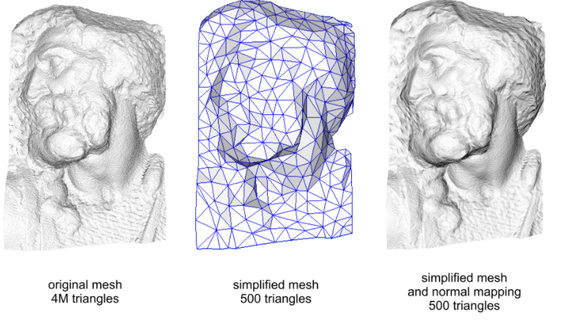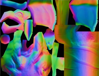 노멀 매핑이란 많은 수의 정점을 가진 오브젝트(모델)의 법선 벡터들을 텍스쳐의 텍셀로 기록하여, 보다 낮은 수의 폴리곤 오브젝트(모델)에 매핑하여 조명 연산할 때 음영을 현재 모델보다 더 퀄리티(입체감) 있게 나타내기 위한 눈속임이라고 볼 수 있다.