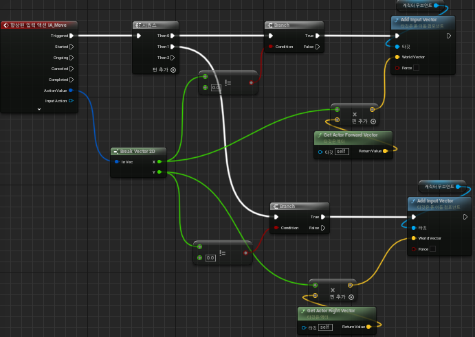 get actor forward vector -> 앞의 방향 벡터를 가져와서 break vector 2d 의 x와 곱하고 그 값을 add input vector 의 world vector 에 준다.