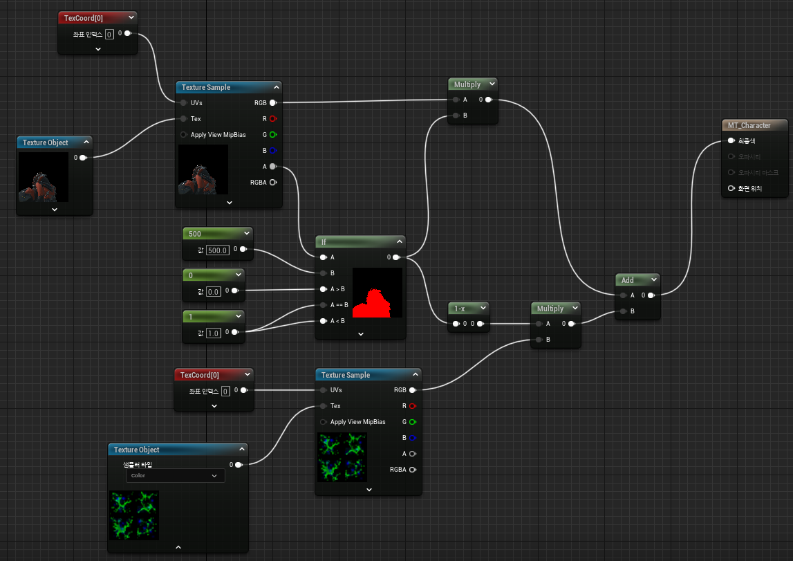 if 문을 통해 깊이 값이 500이하인 부분은 캐릭터 렌더타겟부분을 사용하고, 그 외부는 배경쪽을 사용하도록 혼합하는 수식을 작성한다