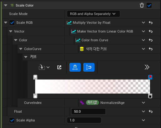 (12) 파티클 업데이트 -> + -> Scale Sprite Size -> 키데이터 세팅 0, 0 / 0.5, 2 / 1, 0