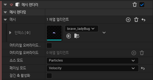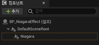 추가 -> Niagara 검색 -> Niagara Particle System Component 해서 Root 밑에 둔다