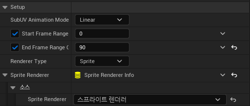 Sub UVAnimation 추가 -> Setup 에서 프레임 0 ~ 90 으로 변경 -> Sprite Renderer 선택