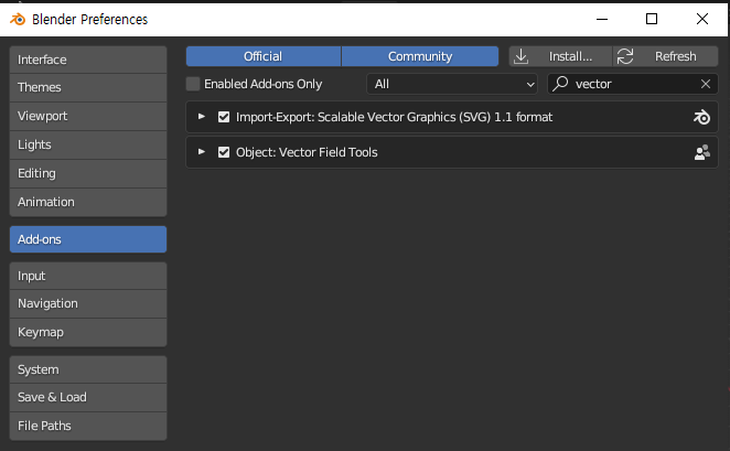 3. Edit -> Preferences -> Add-ons -> vector 검색 -> 활성화