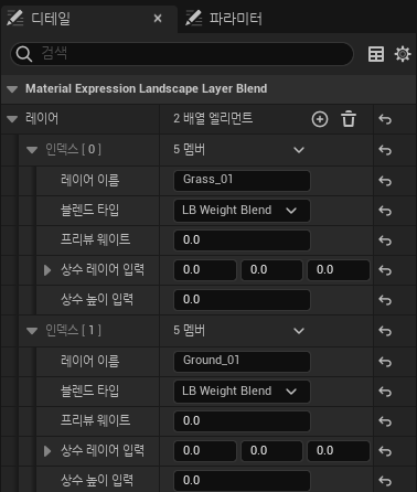 MT_Landscape 의 Layer Blend 노드의 디테일에서 레이어를 추가해주고 이름을 설정해준다.