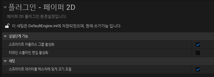 프로젝트 세팅 -> 플러그인 -> 페이퍼 2D -> 스프라이트 아틀라스 그룹 활성화 체크 ( 따로 있는 텍스쳐를 atlas 처럼 뭉쳐준다 )