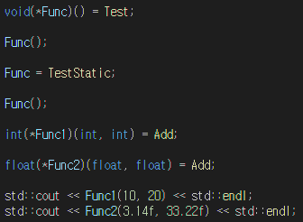 그러므로, 반환타입(*포인터명)(인자타입); 의 형태로 함수 포인터 변수를 선언할 수 있다.