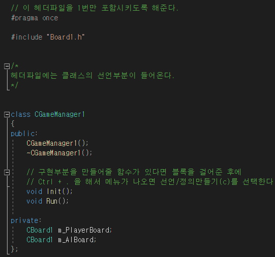 구현부분을 만들어줄 함수가 있다면 블록을 걸어준 후에 Ctrl + . 을 해서 메뉴가 나오면 선언/정의만들기를 선택하거나 C를 누른다.