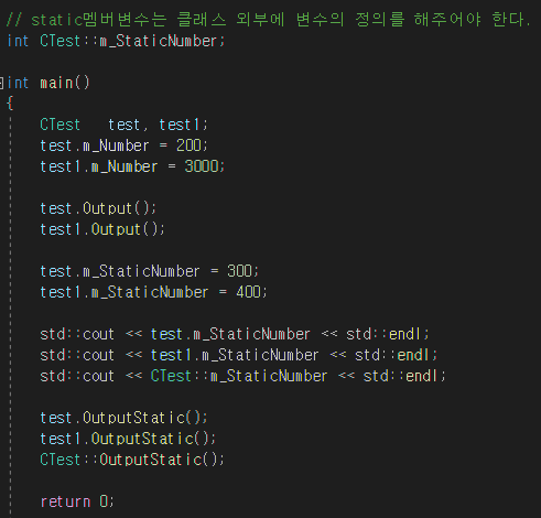 static멤버변수는 사용할때 클래스 외부에 변수의 정의를 해주어야 한다.