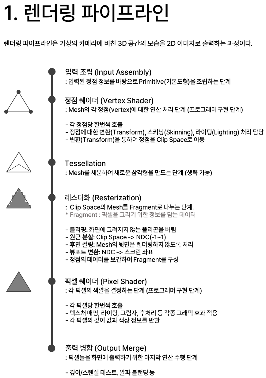 Device Directx11 -> GPU 컨트롤 ComPtrm_Device;// GPU 메모리 할당 ComPtrm_Context;// GPU 제어, 렌더링, 동작 수행 SwapChain -> 연동된 윈도우에 렌더링 장면을 출력 및 교체 작업 ComPtrm_SwapChain; View -> 실제 asset(resource)과 gpu 를 연결해주는 중간층 역할 - RTV - DSV - SRV - UAV 랜더링 파이프라인 IA VS Tessellation - HS - Tesselator - DS GS Resterizer State PS OM - Depth Stencil State - Blend State